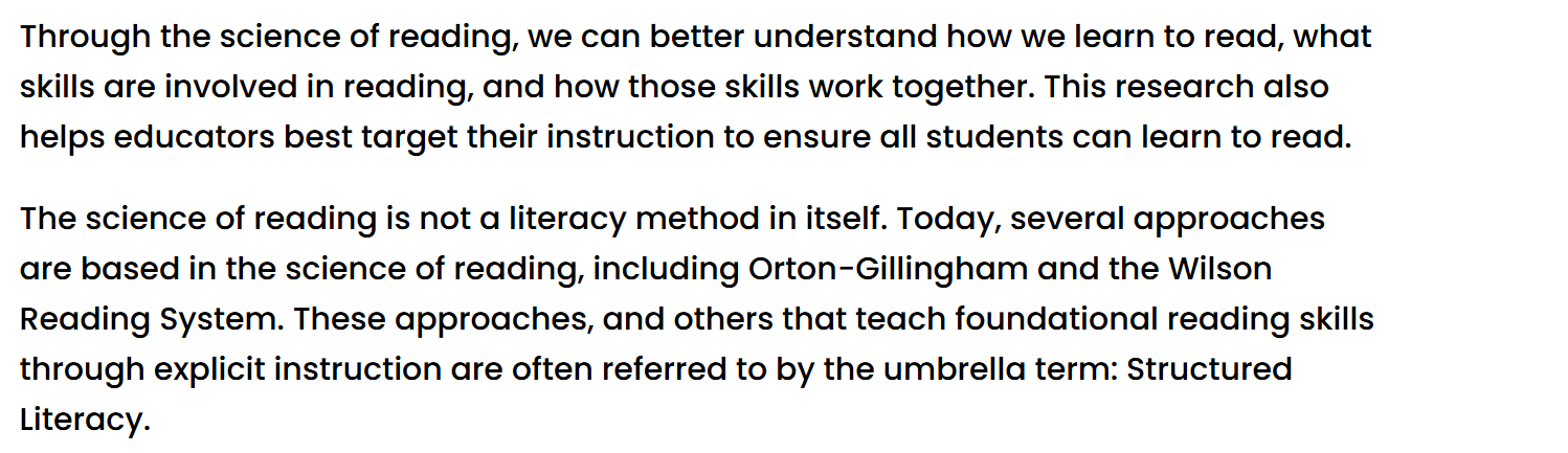 “The body of work referred to as the “science of reading” is not an ideology, a philosophy, a political agenda, a one-size-fits-all approach, a program of instruction, not a specific component of instruction. It is the emerging consensus from many related disciplines, based on literally thousands of studies, supported by hundreds of millions research dollars, conducted across the world in many languages.”